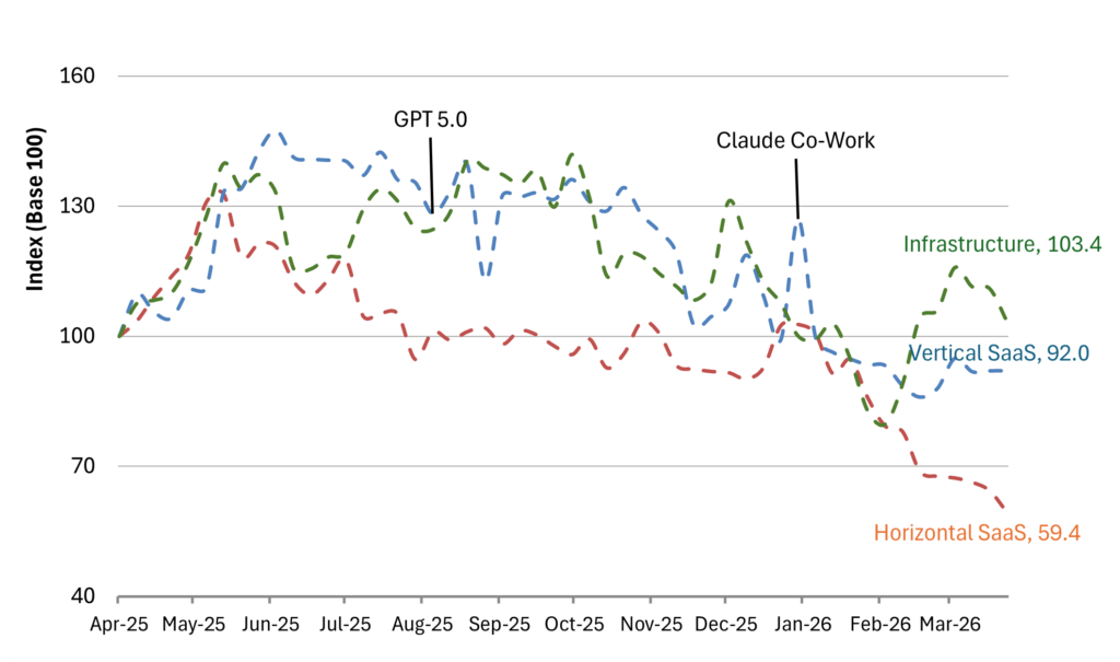 As can be seen in the graph, it isn’t a uniform collapse; it’s the market starting to separate businesses AI can strengthen from those it can increasingly absorb. Over the past 12 months, horizontal SaaS has taken the hardest hit. Vertical SaaS is down, but far less so, and infrastructure has largely stayed protected.